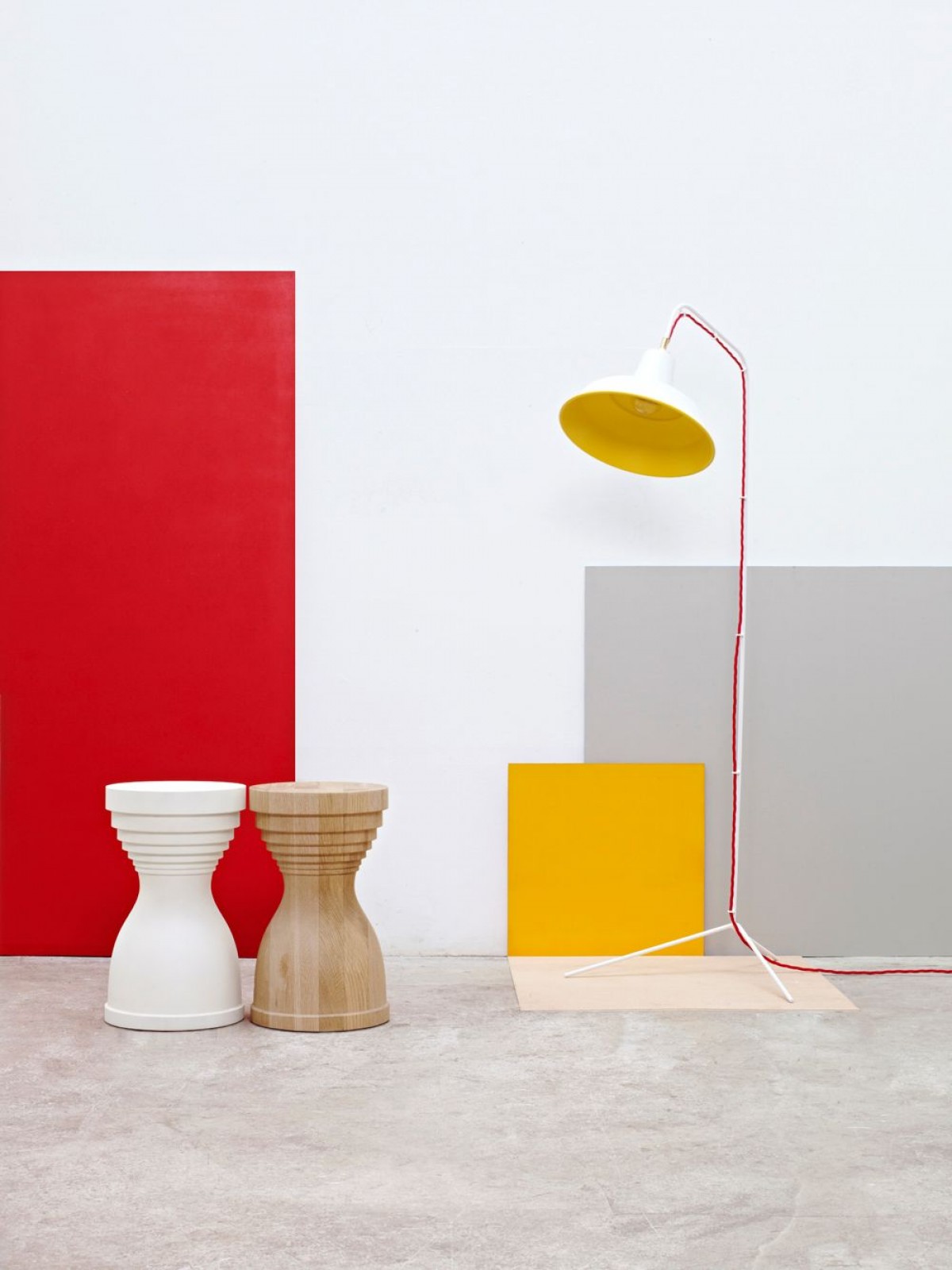 A range of wood-tuned stools . side tables in natural wood.